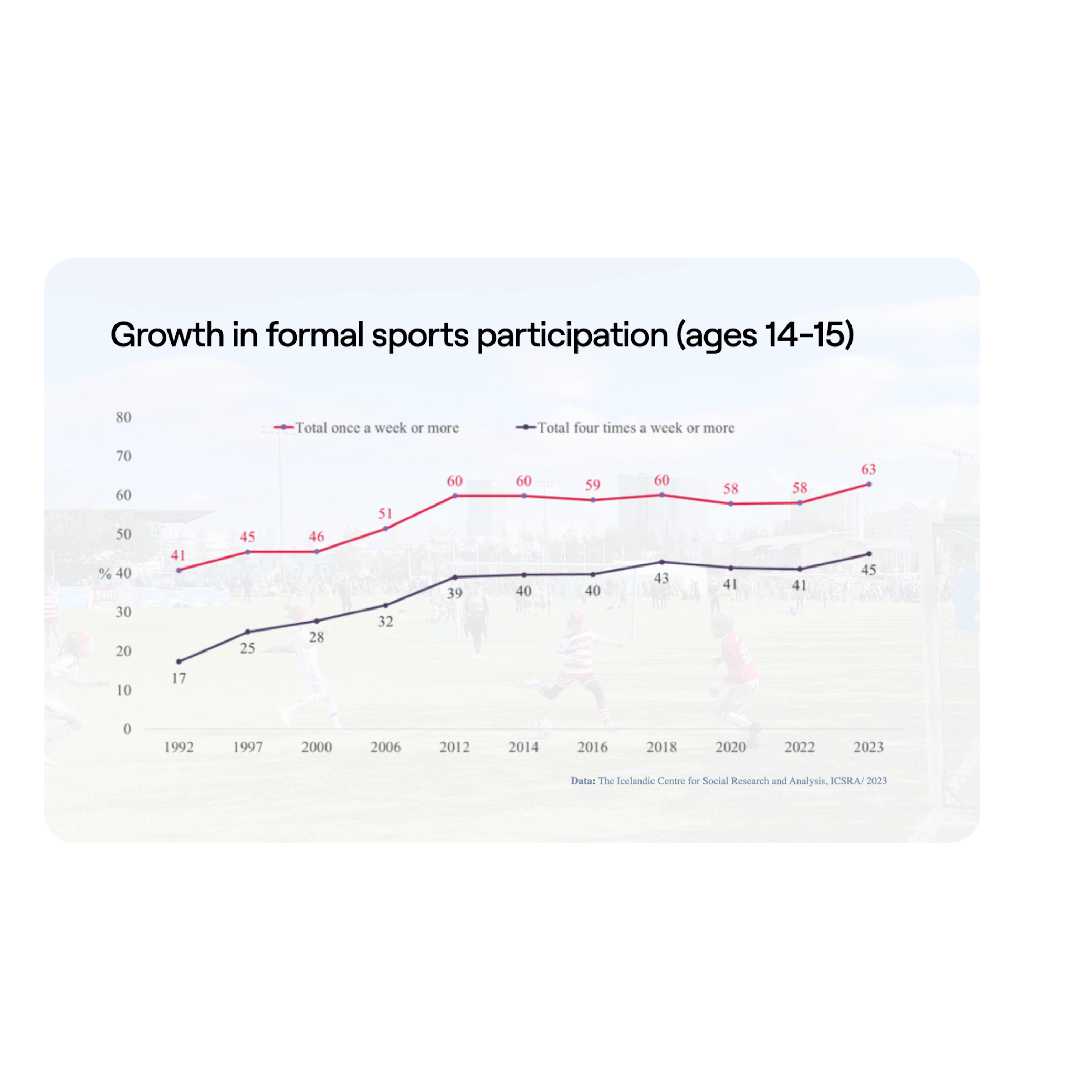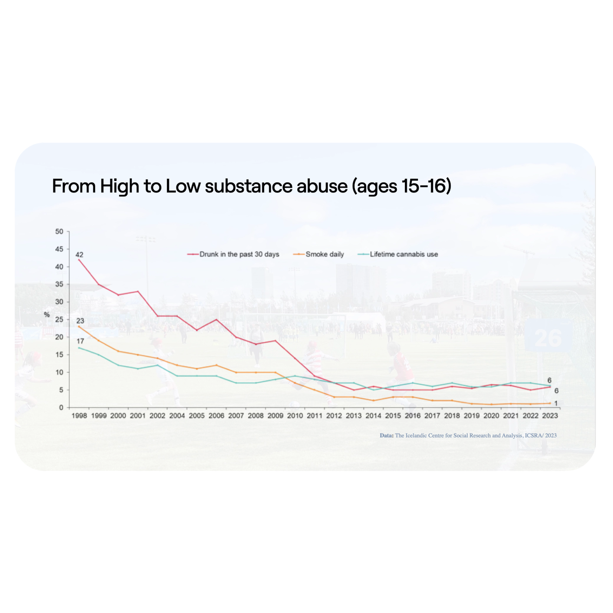 The results were extraordinary: substance use among children and adolescents plummeted, and in just 20 years, Icelandic teens became the cleanest in Europe. This stands as a powerful testament to how investing in sports and sports infrastructure is an exceptionally effective and proportionally cost-efficient way to transform the future of our younger generations, fostering happier, healthier lives.